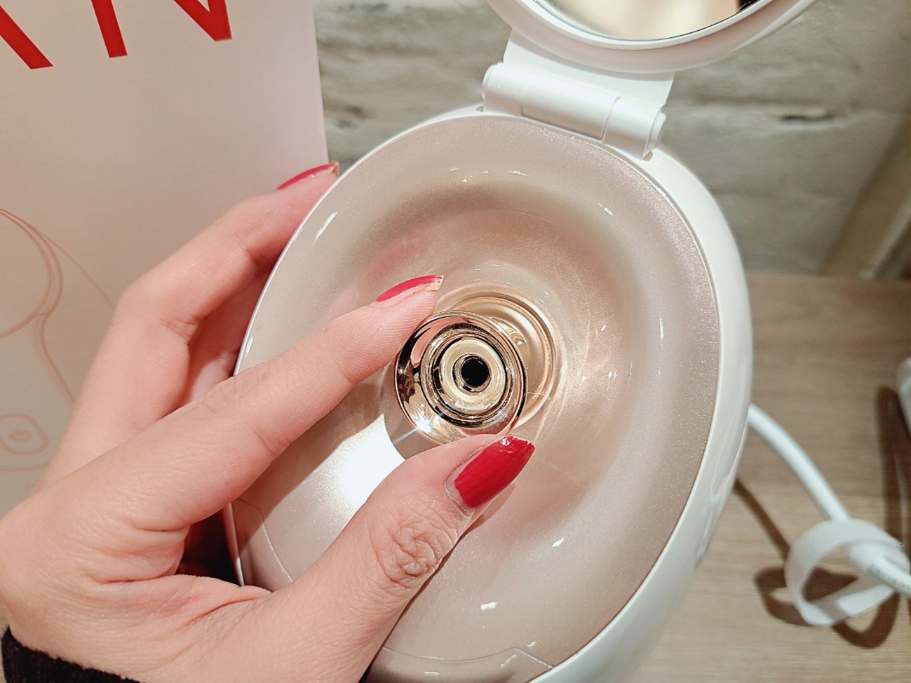 本体はコンパクトなのですが、タンクは145mlと大容量なので、約20分間ゆったりと使用できる点。また、約30秒でスチームが出て来るため、忙しい朝のメイク前などに使いやすい点もとっても気に入りました。