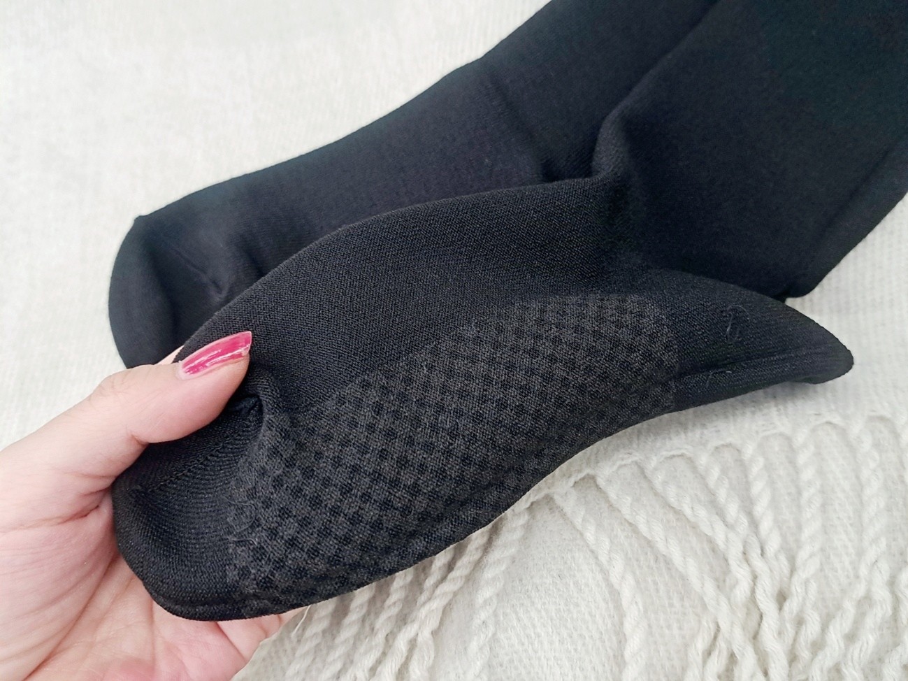 いつものパンプスと合わせられるほど薄手でありながら、「テラヘルツ鉱石」の遠赤外線効果でポカポカ!お出掛け用やお仕事のときの防寒ソックスにぴったりだなと感じました。