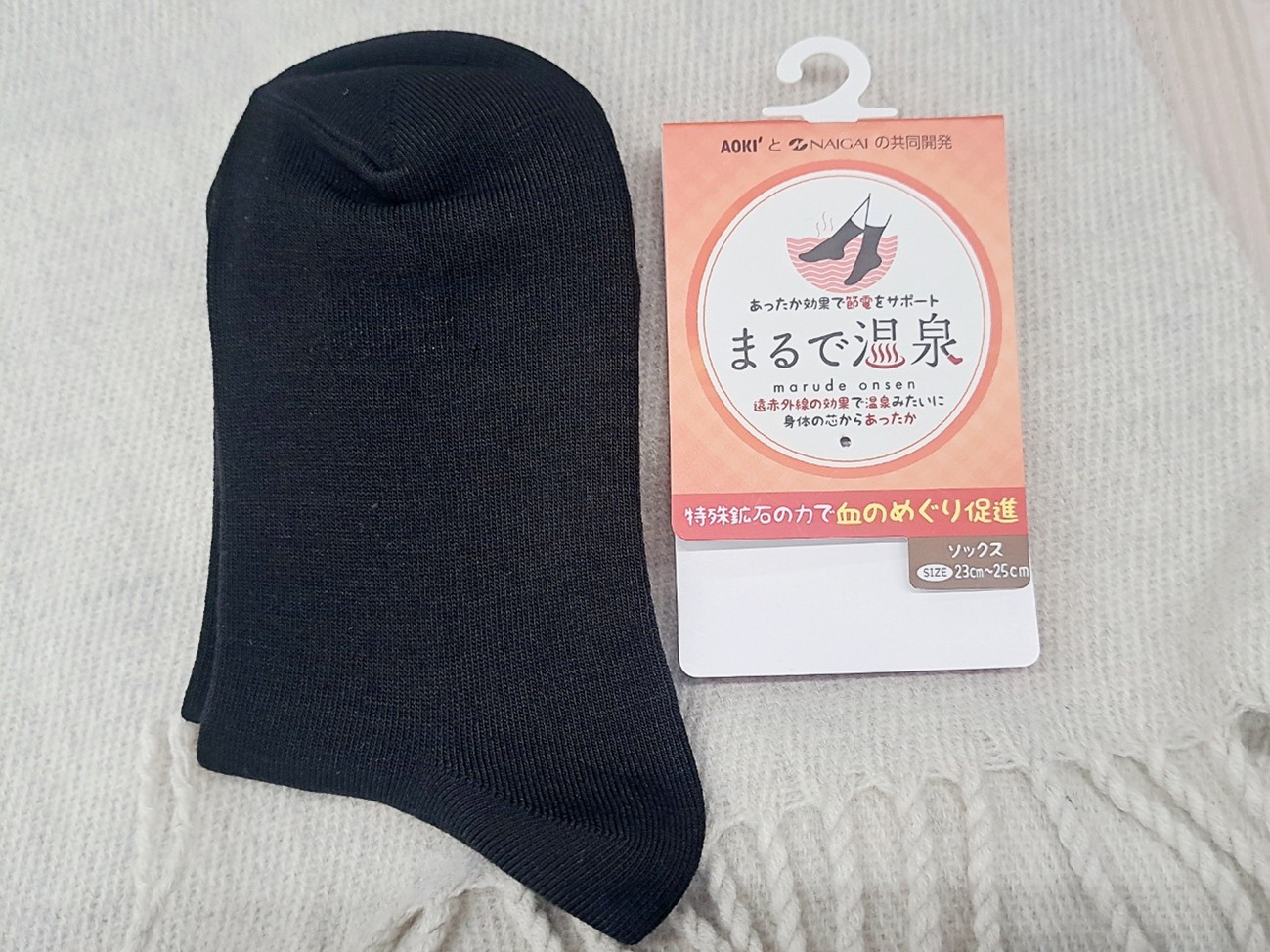 そこで、「薄手でも温かい靴下はないものか」とリサーチしていたところ、ビジネスウェアで有名な「AOKI」と、靴下・レッグウェアの老舗「ナイガイ」が共同開発したという「まるで温泉」というソックスとレッグウォーマーを発見!