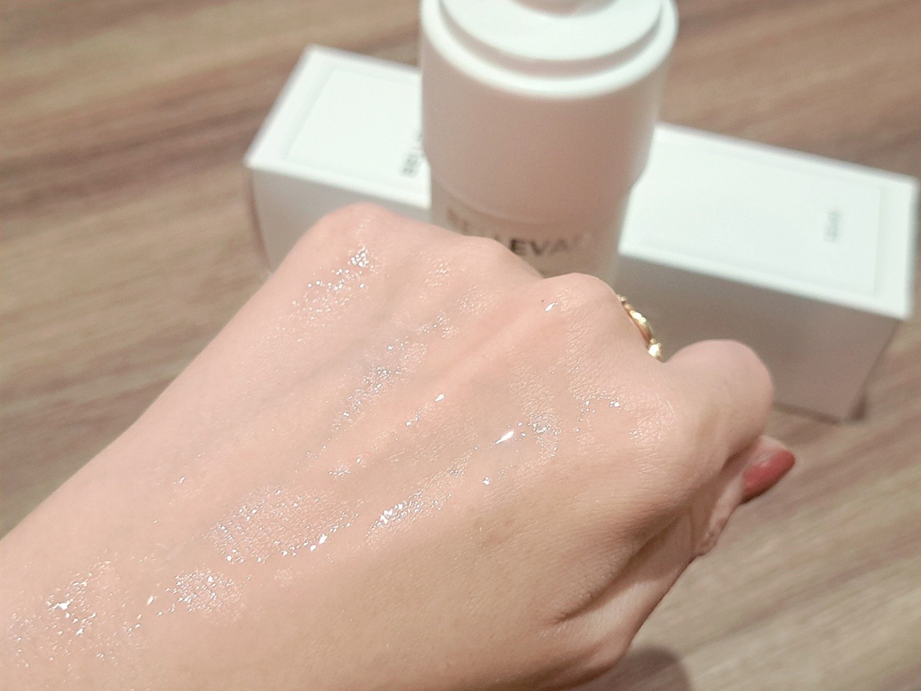 テクスチャーはややとろみがあり、やさしくなめらかなつけ心地で、伸ばしてみると潤い感がたっぷり!高保湿設計でしっとりしたツヤ感が長時間キープされるため、透明感のある肌印象となりました。