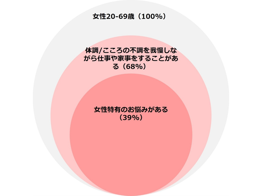 2025年1月に味の素AGFが実施した調査によると、20~69歳の女性のうち約7割が「体調/こころの不調を我慢しながら仕事や家事をすることがある」と答え、その中で「女性特有のお悩みがある」という方が半数以上を占めたのだそうです。