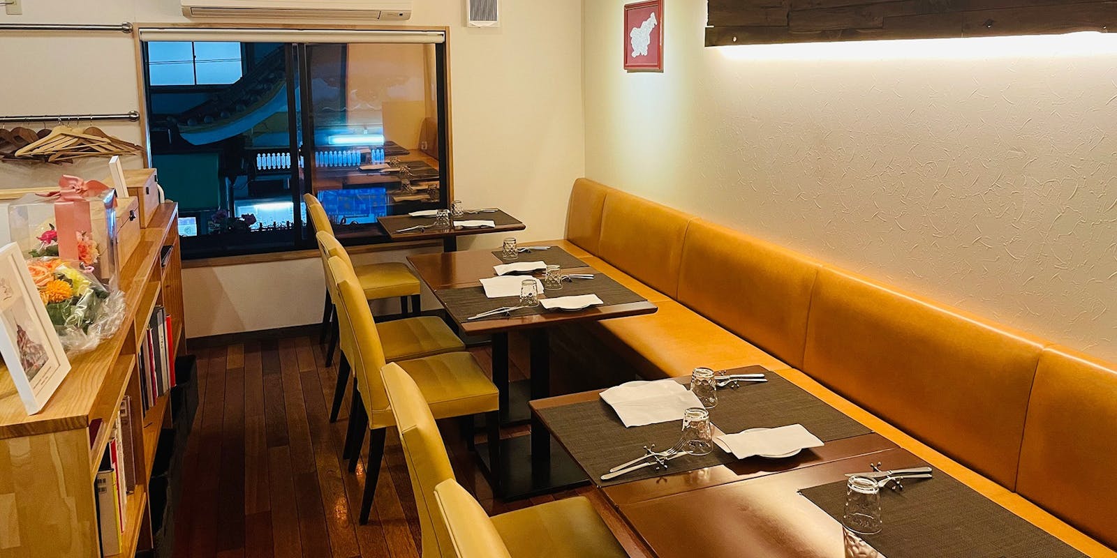 ビストロウエハラは、カジュアルな場面でもフォーマルなシーンでも使えるお店です。1Fはテーブル席とカウンター席、2Fはテラス席に加えて片面ソファーとなっているテーブル席が用意されています。