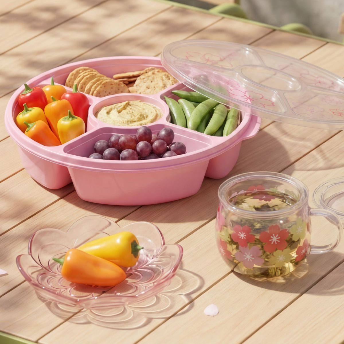 深さ6.5cm、直径27.5cmと大き目サイズのコンテナで、5つの仕切りがついています。