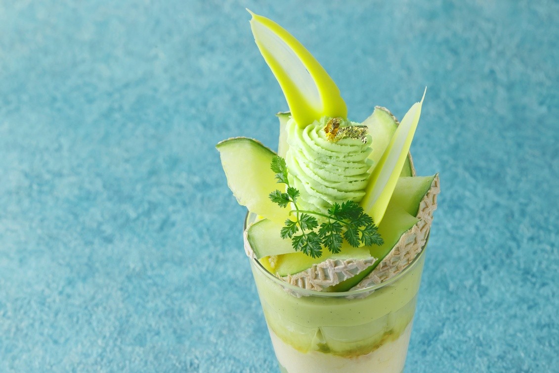 グラスの下層にはメロンの香りを閉じ込めたパンナコッタ、果汁感あふれるメロンゼリー、ココナッツのコクとまろやかな甘みが広がるロワイヤルココを重ね、香りと甘みの変化を段階的に楽しめるような三層構成になっています。