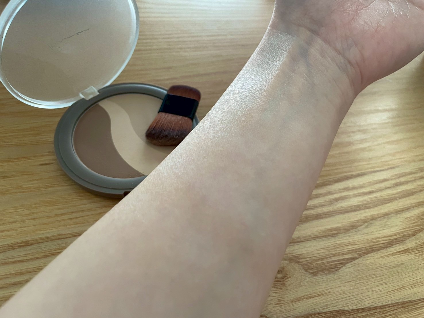 塗り方が悪いのか腕の色と合っていないのか(逆にいうと、肌に馴染んでいる?)、3〜4回塗り重ねてもあまり発色しませんでした。