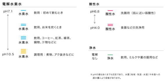 「TRIM ION Refine」は、飲用や様々な調理に適した「電解水素水※3」、洗顔や掃除に活用できる「弱酸性水」、赤ちゃんのミルクづくりや薬の服用に使用できる「浄水」の3種類の水を作ることが可能になっています。