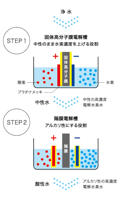 最初に「電解水素水」とは、整水器を用いて水道水を浄水・電気分解して生成される、水素を含んだアルカリ性の水のことで、胃腸症状の改善が認められています。
