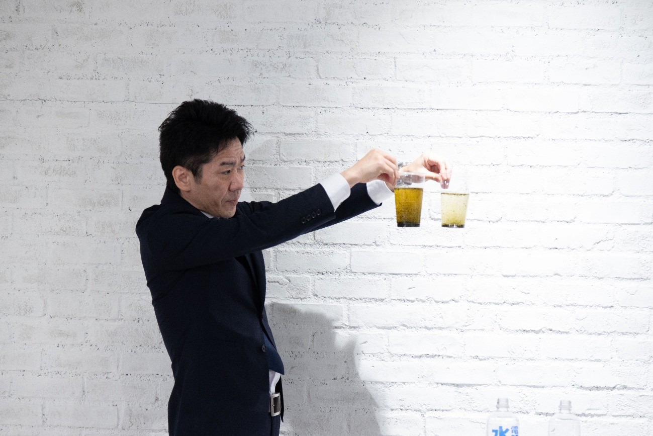この話を受け、日本トリムの平井氏より、電解水素水と一般的な水との違いに関するデモンストレーションが披露されました。常温の水道水と電解水素水をそれぞれ緑茶の茶葉が入ったグラスに注ぐと、電解水素水の方は注いだ瞬間にお茶が抽出され、会場からは驚きの声が!