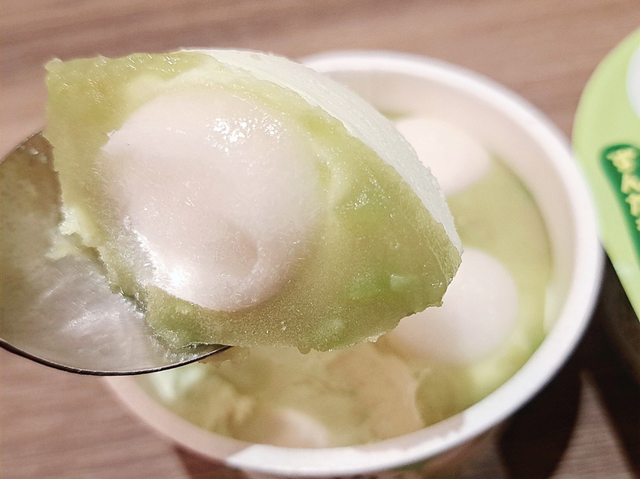 天面には「やわもちアイス」の特徴でもある5つのおもちがくるりと並び、その下に渋みのある黄緑色のずんだあんが敷き詰められています。